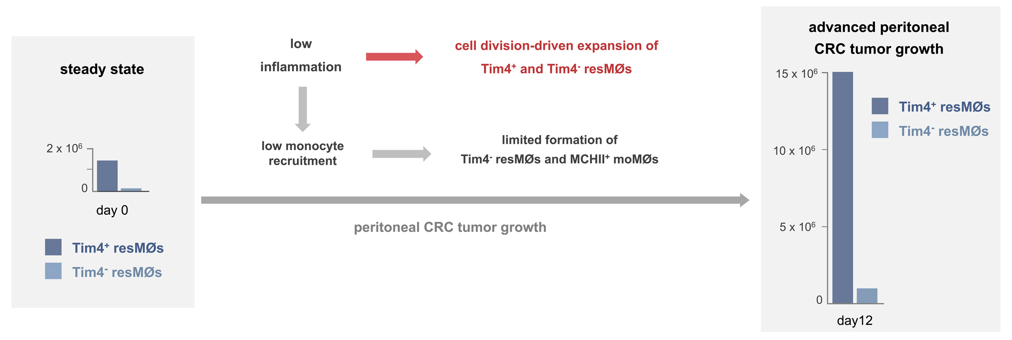 Our data support that the low inflammatory status of the peritoneal cavity associated to CRC peritoneal tumor growth, restrained monocyte recruitment and formation of monocyte-derived non-resident macrophages, while enabling a marked cell proliferation-driven expansion of resident peritoneal macrophages. Tumor-induced Tim4+ TREM1+ resident peritoneal macrophages displayed a migratory and protumor transcriptomic signature, involving the activation of genes encoding important pro-tumorigenic molecules and potential targets for immunotherapy, such as A2A/A2B, ARG1, IRG1, PD-L1/2, SPP1 or TREM1. Correspondingly, during peritoneal CRC tumor growth, Tim4+ TREM1+ resident peritoneal macrophages migrated to the omentum, the main peritoneal target organ for peritoneal metastasis, and promoted CRC peritoneal tumor progression (Ferriz et al., Cancer Immunology Research 2026).